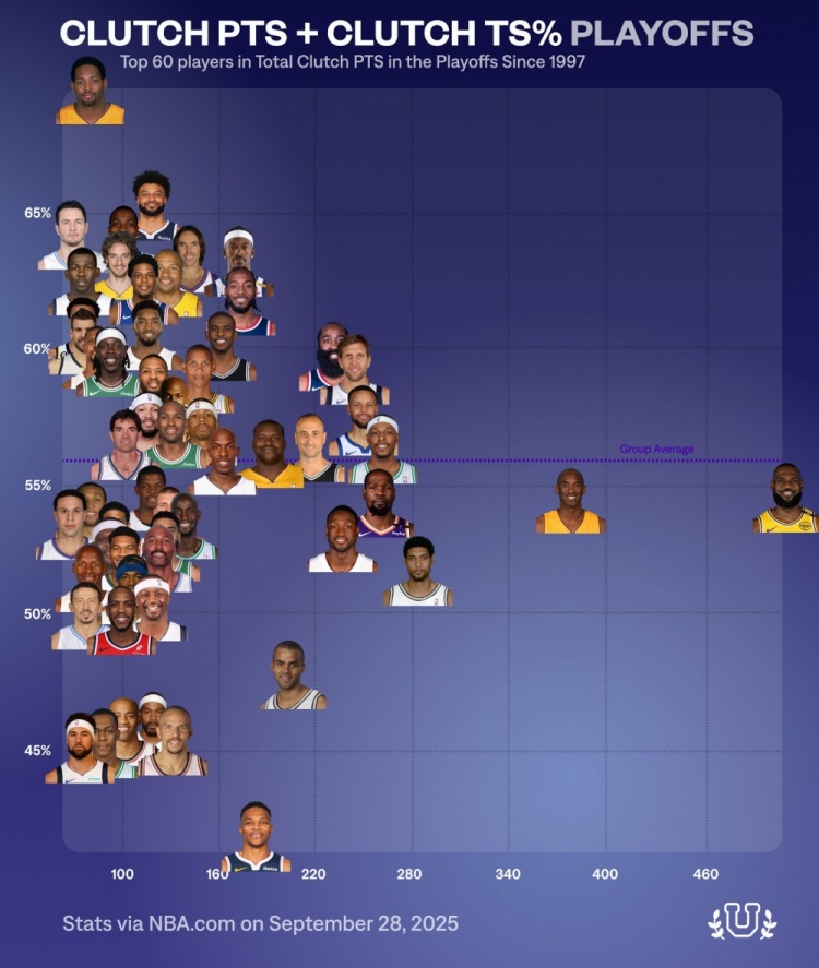 9月29日讯 近日,数据媒体NBA University总结了自从1997年以来(NBA官网该项数据统计起始时间)在NBA季后赛中关键得分前60球员的真实命中率分布图表。